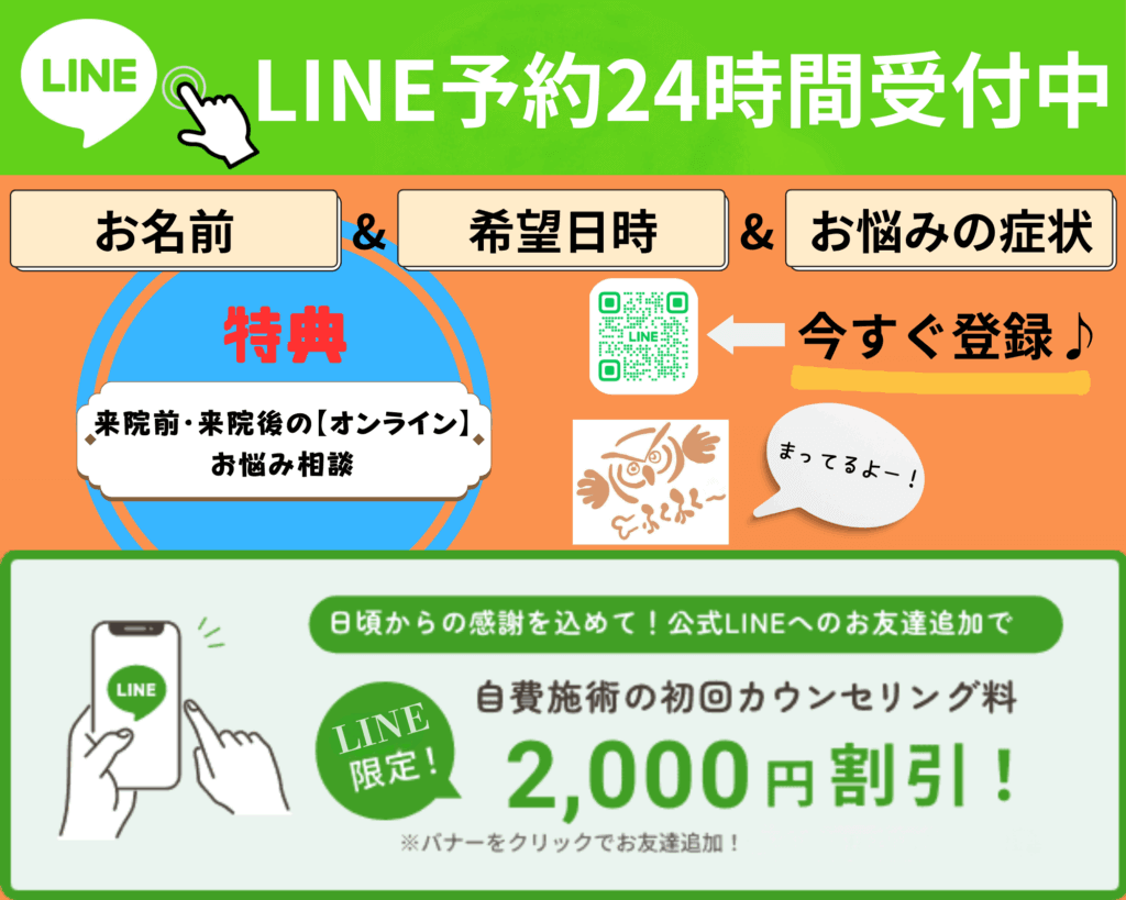 (*)施術希望のお問い合わせが当日、前日などの直前ですと、予約枠がうまっている場合がございます。