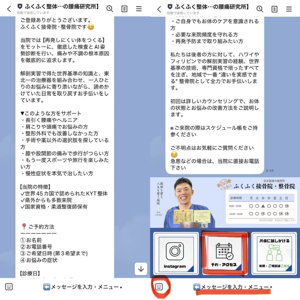 LINEでは来院前の相談なども随時受け付けておりますので、お体のお悩みについて来院前にお聞きしたいことなどございましたらメッセージをください。